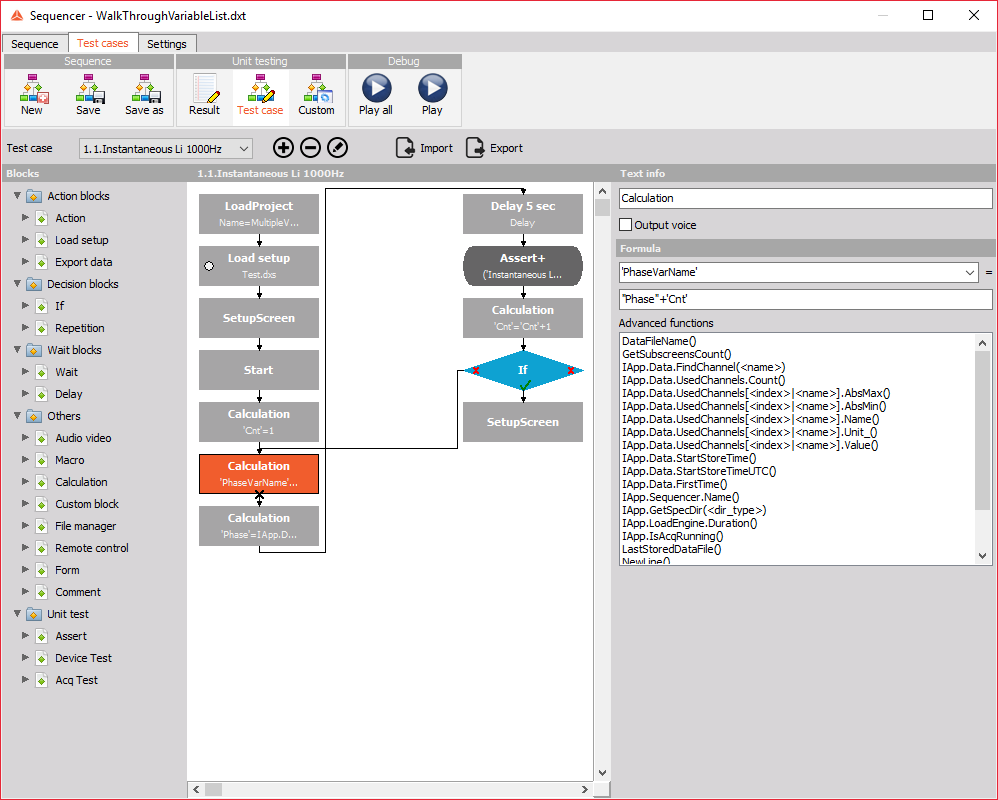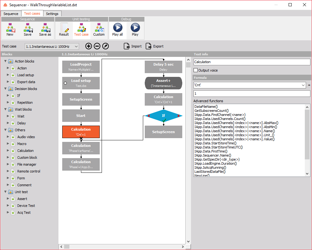- In the sequencer, we first add an action block to load the project and the second one to load a setup with a user input which will use the global variables.