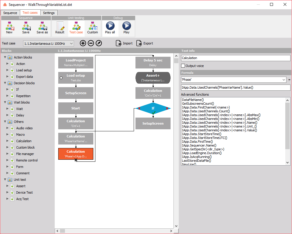 - This phase will be used for 5 seconds, then we increase the counter by 1 using the calculation block with the formula 'Cnt'='Cnt'+1. We use an if decision block, to check if we are at the end of the list. If we aren't we go back to the calculation block which forms the variable name and if we are we finish with the sequence.