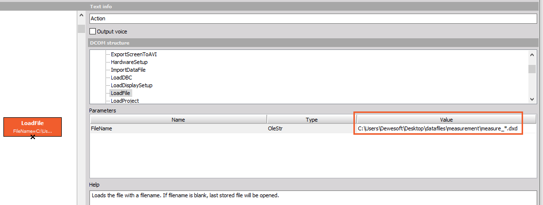 Use the Action block and find the "LoadFile" in the DCOM structure. Insert the multifile name and path to the multifile. You just need to use the * symbol instead of the sequence number as a parameter of the datafile. Please note that you can't open multifile as long as the last file is in writing mode.
