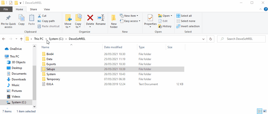 The Setup file has a .dxs ending in the Setups folder, located in the Dewesoft folder.