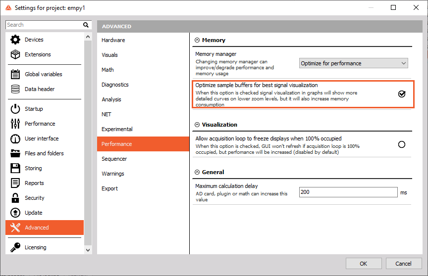 It can happen, that for some applications, Dewesoft will switch too soon to the next level of reduced buffer. For such applications we made a special setting, which will improve visual quality (less blobbing), but on the other side it will increase buffer sizes, causing lower performance and increased memory consumption. If this option is used it is highly advisable to use 64-bit version of Dewesoft. Note that underlying "Optimize channel buffers for visualization if available from Dewesoft X3 SP7 onward.