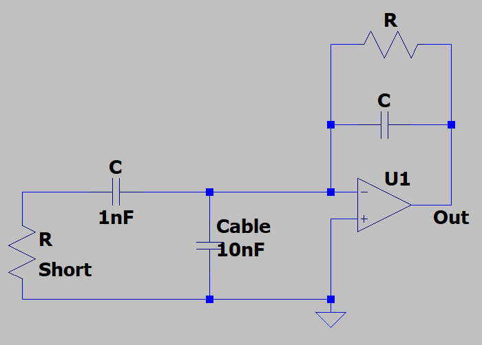 Typical coax cable capacitance is 100 pF per meter. Eg. 100 m cable will add 10000 pF or 10 nF capacitance.