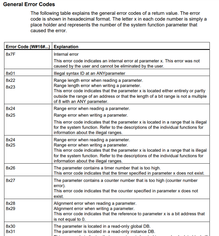 When we know our error code values, we can go to search them into the Siemens manual. Page 2-2 (#82) contains error codes that are helpful for us in this case.